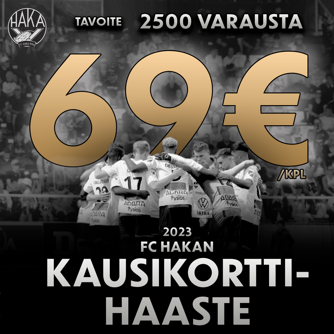FC Haka aloittaa kausikorttihaasteen. Tavoiteltavan 2500 kpl varausmäärän toteutuessa saa haasteaikana varatun kausikortin FC Hakan Veikkausliigan 2023 kotiotteluihin 69€ hintaan (+toimituskulu). Haaste on voimassa aina 31.10.2022 saakka. Kausikortin normaalihinta on 200€/kpl. Kotiotteluita on normaalimittaisessa sarjassa 13-18 kpl.