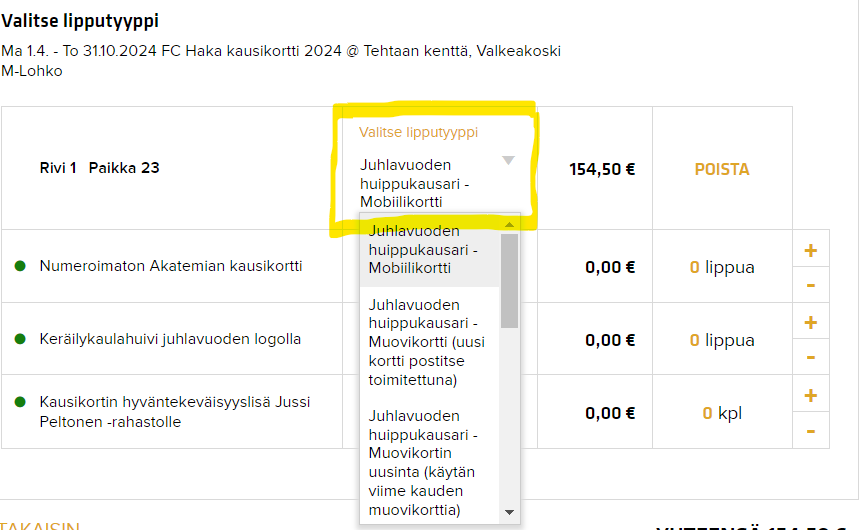 ESIMERKIKSI: Jos valitset kausikortin, joka sisältää oikeuden varata oman istumapaikan koko kaudelle (Juhlavuoden huippukausari, Tukirenkaan huippukausari tai Lasten fanikausari), lipputyyppi tulee valita vielä harmaasta kolmiosta aukeutuvasta valikosta.