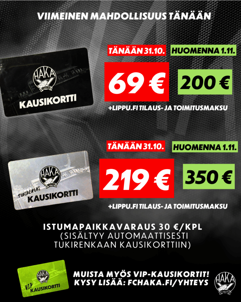 FC Hakan Tukirenkaan jäsenille kausikortti on saatavilla tarjoushintaan 219 € (+ Lippu.fi tilaus- ja toimitusmaksu, sisältää istumapaikkavarauksen) myös tämän päivän loppuun asti. Tukirenkaan kausikortin hinta nousee normaalihintaiseksi 350 €:oon 1.11. alkaen.