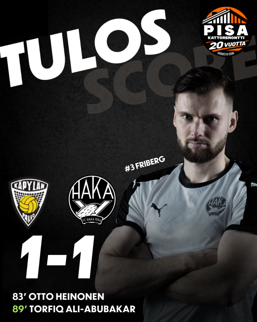 Kauaa ei johto kuitenkaan kestänyt, sillä Haka tasoitti loppulukemiksi 1-1 vain kuusi minuuttia myöhemmin. Oikealta lähtenyt keskitys jäi pomppimaan boksiin, missä lopulta Torfiq Ali-Abubakar pääsi vaikeasta asennosta kääntämään ja tuikkasi pallon taidokkaasti kotijoukkueen verkkoihin.