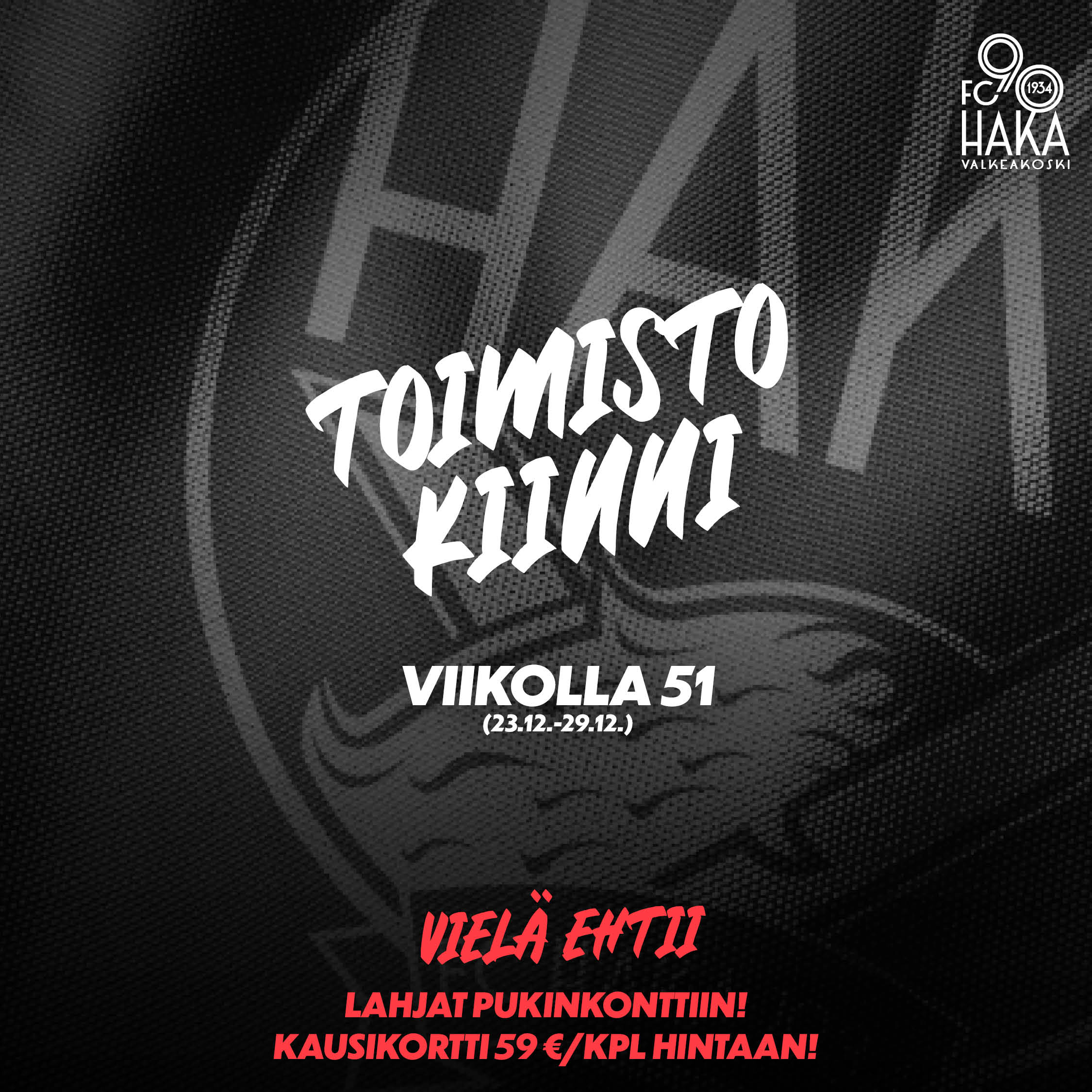 FC Hakan toimisto on avoinna normaalisti arkisin klo 10 – 15, pois lukien ma 23.12. ja pe 27.12., jolloin toimisto on kokonaan kiinni (juhlapyhien lisäksi).