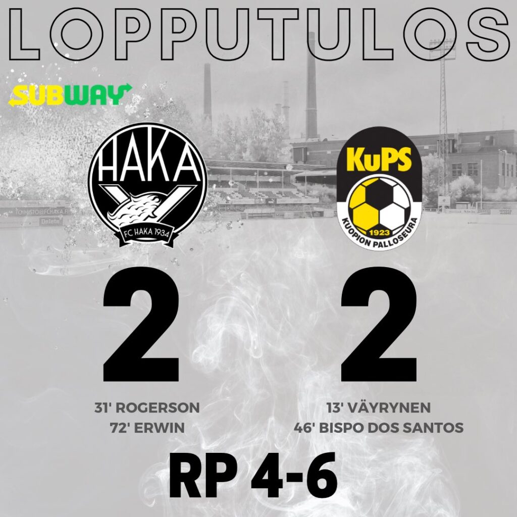 Erinomaisesti KuPS:a vastaan jälleen pelanneen Hakan ansaittu tasoitus tuli lopulta 72. minuutilla. Salomo Ojala lähetti Rogersonin oikealta laidalta vauhtiin ja laituri pääsi lähes päätyviivalta syöttämään pallon maalin edustalle mihin Erwin juoksi oikea-aikaisesti ja sijoitti pallon varmasti verkkoihin.