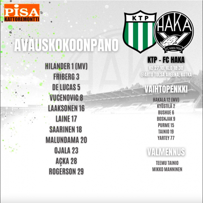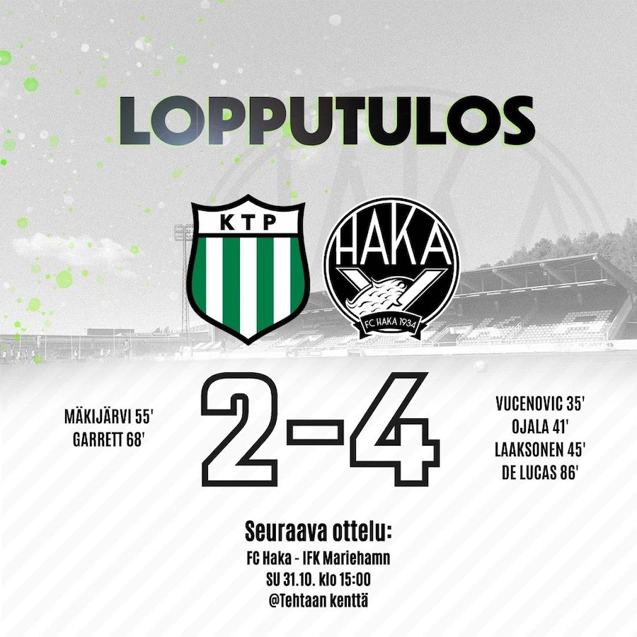Veikkausliigan toiseksi viimeinen kierros pelattiin keskiviikon iltavaloissa, jolloin FC Haka matkasi KTP:n vieraaksi Arto Tolsa Areenalle. Valkopaidat eivät antaneet putoajalle mahdollisuuksia, vaan nappasivat kotkalaisista maali-iloittelussa voiton 2-4 -lukemin.