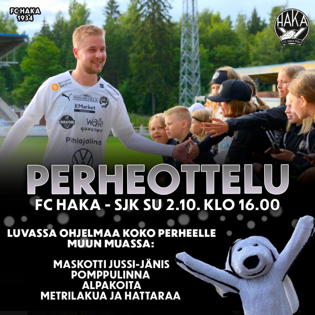 FC Haka – SJK pyörähtää käyntiin sunnuntaina 2.10. kello 16.00 Tehtaan kentällä. Ottelu on myös samalla perheottelu, minkä järjestelyistä ja muun muassa edullisesta perhelipusta voit lukea tarkemmin täältä.
