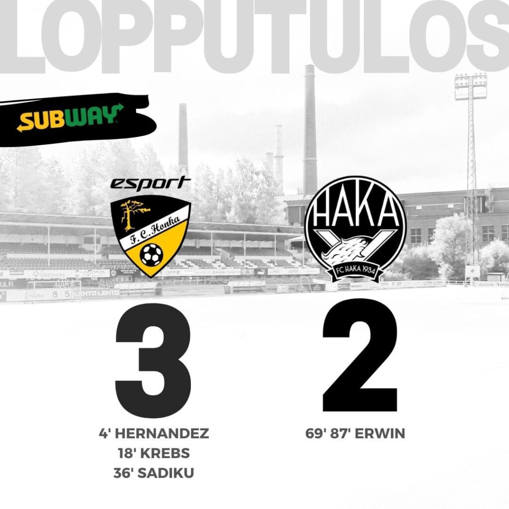 Lopullisesti ensimmäisen jakson synkensi Agon Sadiku, joka pääsi tuikkaamaan läheltä puoliaikalukemiksi 3-0 36. minuutilla. Hongan hyökkäyspelaamisessa tuntui onnistuvan kaikki ensi jaksolla ja kolmas maali kruunasi avauspuolikkaan dominoinnin. Lyhyillä syötöillä Haka -puolustuksen puhkonut hyökkäyskuvio sopii malliesimerkiksi junioreille ja sitä varmasti tullaan myös Hakan tulevissa videopalavereissa käymään läpi.