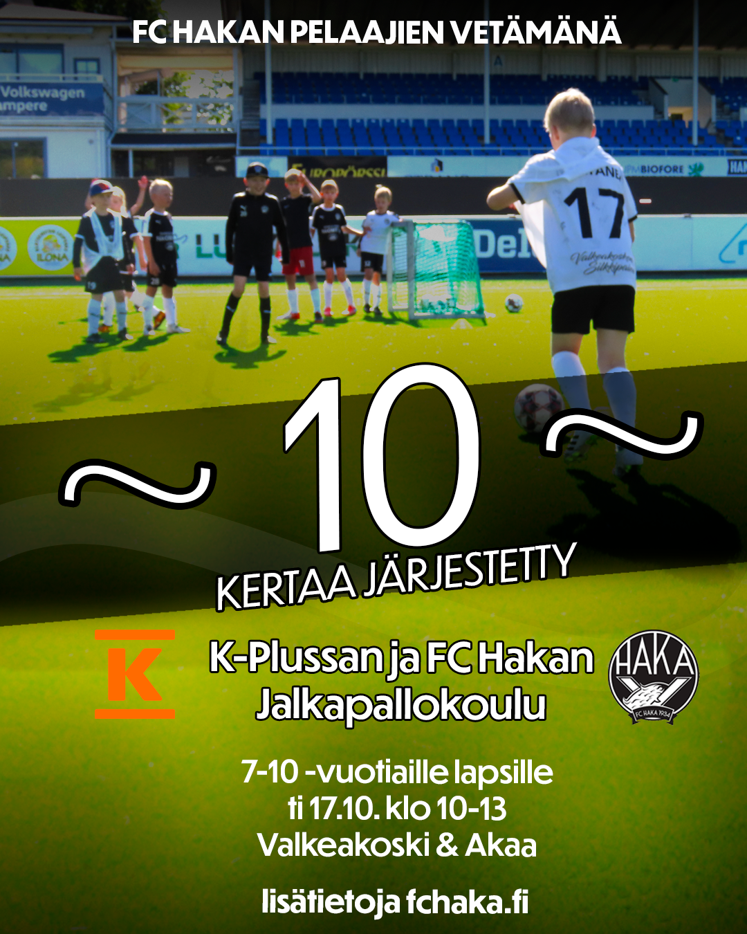 K-Plussa ja FC Haka järjestävät syysloman virikkeeksi ilmaisen jalkapallokoulun alueen 7–10-vuotiaille lapsille. Jalkapallokoulussa leikitään, harjoitellaan ja pelaillaan Hakan pelaajien ja valmentajien johdolla. Tervetulleita ovat kaikki kiinnostuneet 7–10-vuotiaat. Jalkapallokoulu järjestetään samanaikaisesti ti 17.10. klo 10–13 Valkeakoskella Tehtaan kentällä ja Viialan tekonurmikentällä.