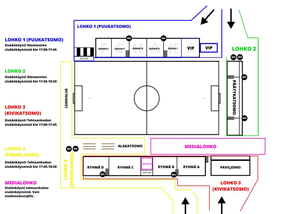 Yleisökapasiteettia on hivenen pystytty nostamaan lohkojaon uudistamisella. Tarkasta oheisesta kartasta uusi lohkojako, sekä kunkin lohkon sisäänpääsyaika. Lohkoja on kaikkiaan viisi kappaletta, mutta medialohkoon ei ole lippuja myynnissä ja sinne on pääsy vain median edustajilla, sekä henkilökunnalla.
