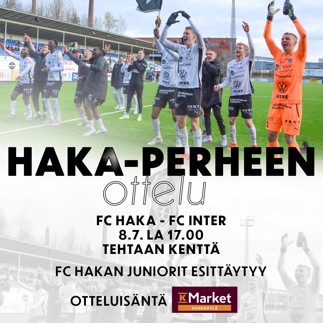 Ylihuomenna Tehtiksellä pelataan FC Hakan ja FC Interin välinen ottelu, jossa juhlistetaan Haka-perhettä! FC Hakan juniorijoukkueet esittäytyvät puoliajalla Tehtaan kentällä, joten nyt on aika yhdessä juhlistaa upeita juniorijoukkueita ja tulevia Tehtiksen taistelijoita.