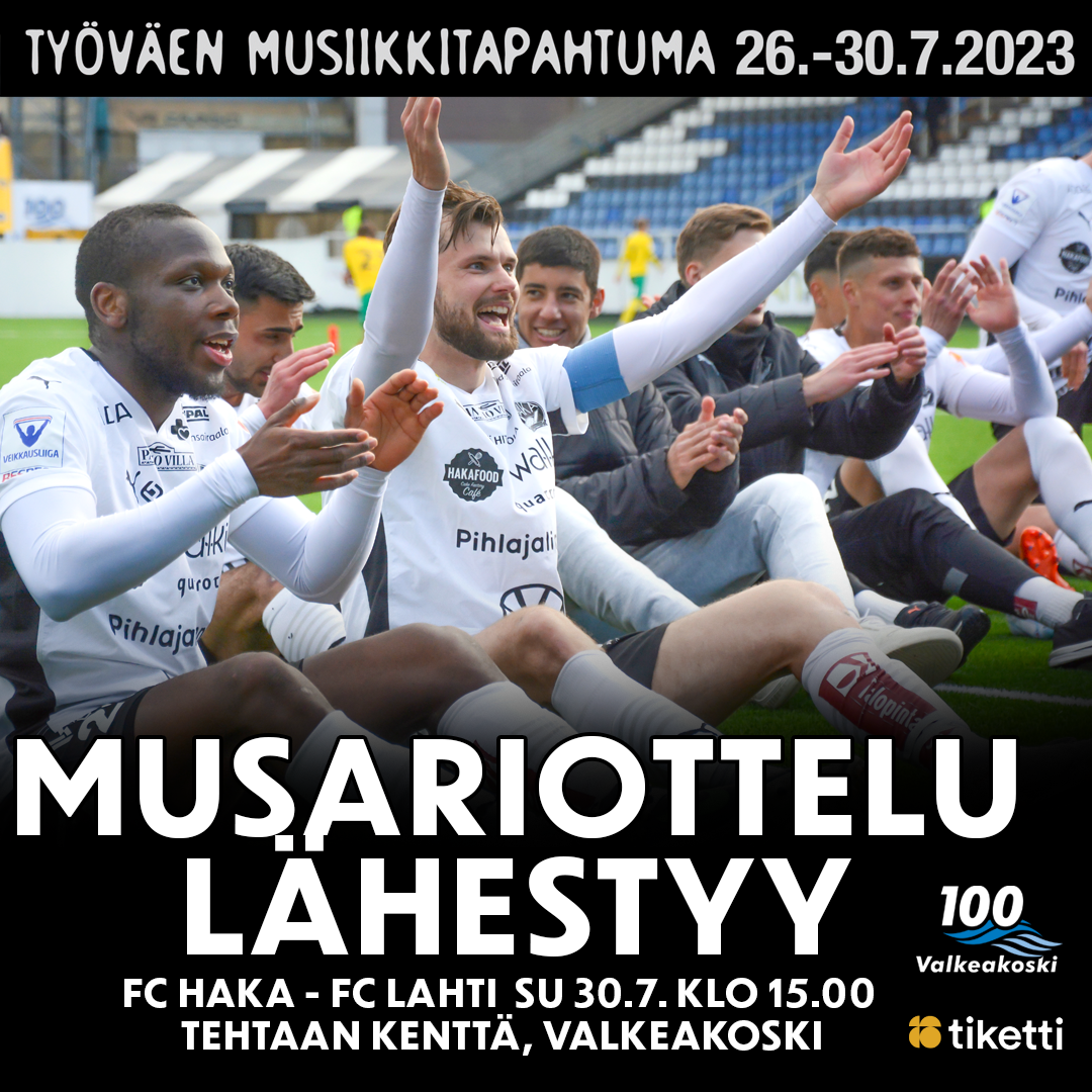 Valkeakosken yksi kesän odotetuimmista tapahtumista on Työväen Musiikkitapahtuma, jonka ohessa FC Haka on perinteisesti pelannut ”Musariottelun”. Tänä vuonna Musareiden aikaan FC Haka kohtaa FC Lahden sunnuntaina 30.7. klo 15.00. Viime vuonna Musariottelussa sunnuntaipäivän perinteinen Lasten tapahtuma saapui Tehtaan kentälle ja niin myös tänä vuonna!