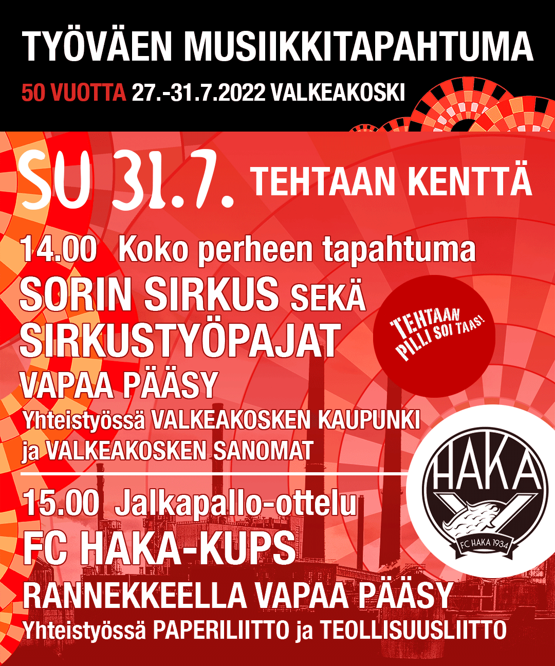 Valkeakosken yksi kesän odotetuimmista tapahtumista on Työväen Musiikkitapahtuma, jonka ohessa FC Haka on perinteisesti pelannut ”Musariottelun”. Tänä vuonna festivaalit osuu samalle viikonlopulle, kun FC Haka kohtaa KuPSin ensi sunnuntaina 31.7. klo 15.00. Erityisestä tunnelmastaan kotiyleisölle tuttu Musariottelu on tänä vuonna ainutlaatuinen, kun Musiikkitapahtuman perinteinen sunnuntaipäivän Lasten tapahtuma saapuu Tehtaan kentälle. Nyt on huikea mahdollisuus nauttia Valkeakosken kulttuuritarjonnasta täysin siemauksin!