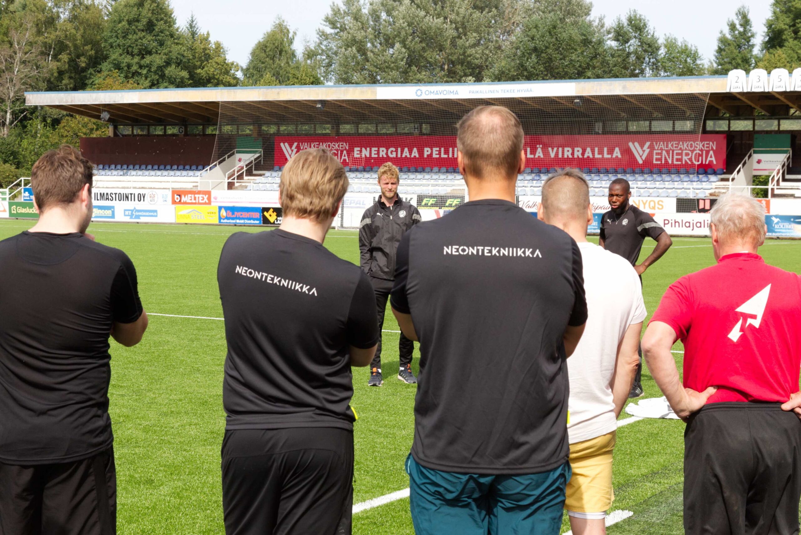 Kahvin ja luennon jälkeen oli aika vaihtaa urheiluvälineet päälle sekä siirtyä legendaarisen Tehtaan kentän nurmelle. FC Hakan pelaajista paikalla olivat Henri Malundama, sekä Tino Purme, jotka ensin vetivät Neontekniikan toiveiden mukaisesti MAS -testin. Kuntoilun jälkeen oli edessä kevyempää, pelureiden vetämää leikkimielistä kilpailua pallojen kera tottakai, sillä jalkapallokentällähän nyt oltiin.