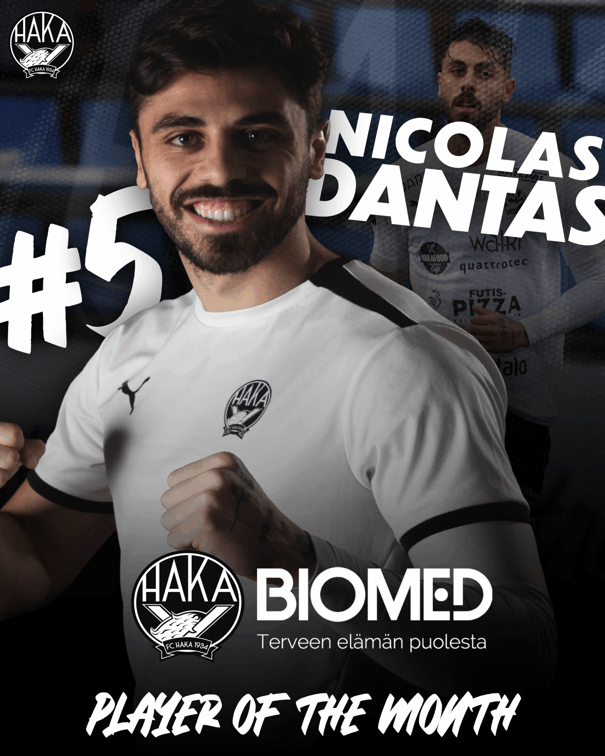 Kaudella 2025 FC Haka yhteistyössä Biomed Healthin kanssa järjestää joka kuukausi kuukauden pelaaja-äänestyksen! Dantas voitti toukokuun tiukan äänestyksen saaden n. 38.7% äänistä, kun toiseksi tullut Da Sylva keräsi 34.5% äänistä. Kolmanneksi sijoittui Riku Selander (n. 19.6% äänistä) ja neljänneksi Mikael Almén (n. 7.14% äänistä) Kesäkuun äänestyksen alkamisesta ilmoitetaan Hakan nettisivuilla & sosiaalisen median kanavissa kuun vaihteessa. Äänestäjien kesken arvotaan kuukausittain Biomedin tuotepaketti, jonka arvo on yhteensä 74 € ja sisältää mm. Vuoden 2025 terveystuotteen – Premium Magnesium Complexin!