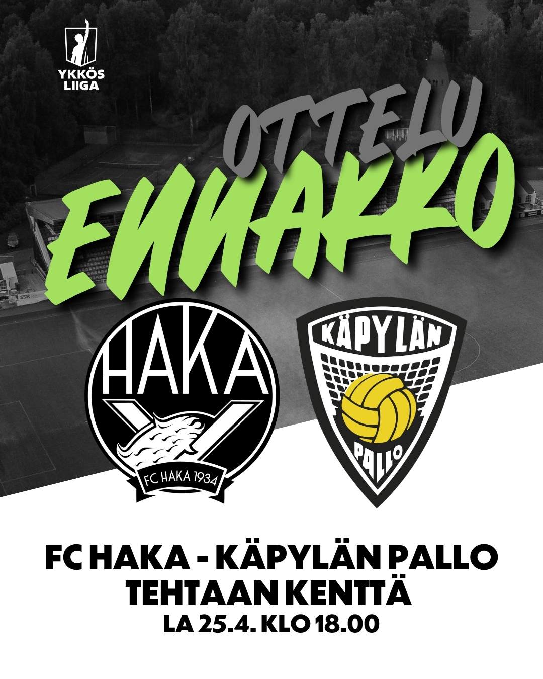 FC Haka – Käpylän Pallo lauantaina 25.4.2026 kello 18.00 Tehtaan kentällä.
