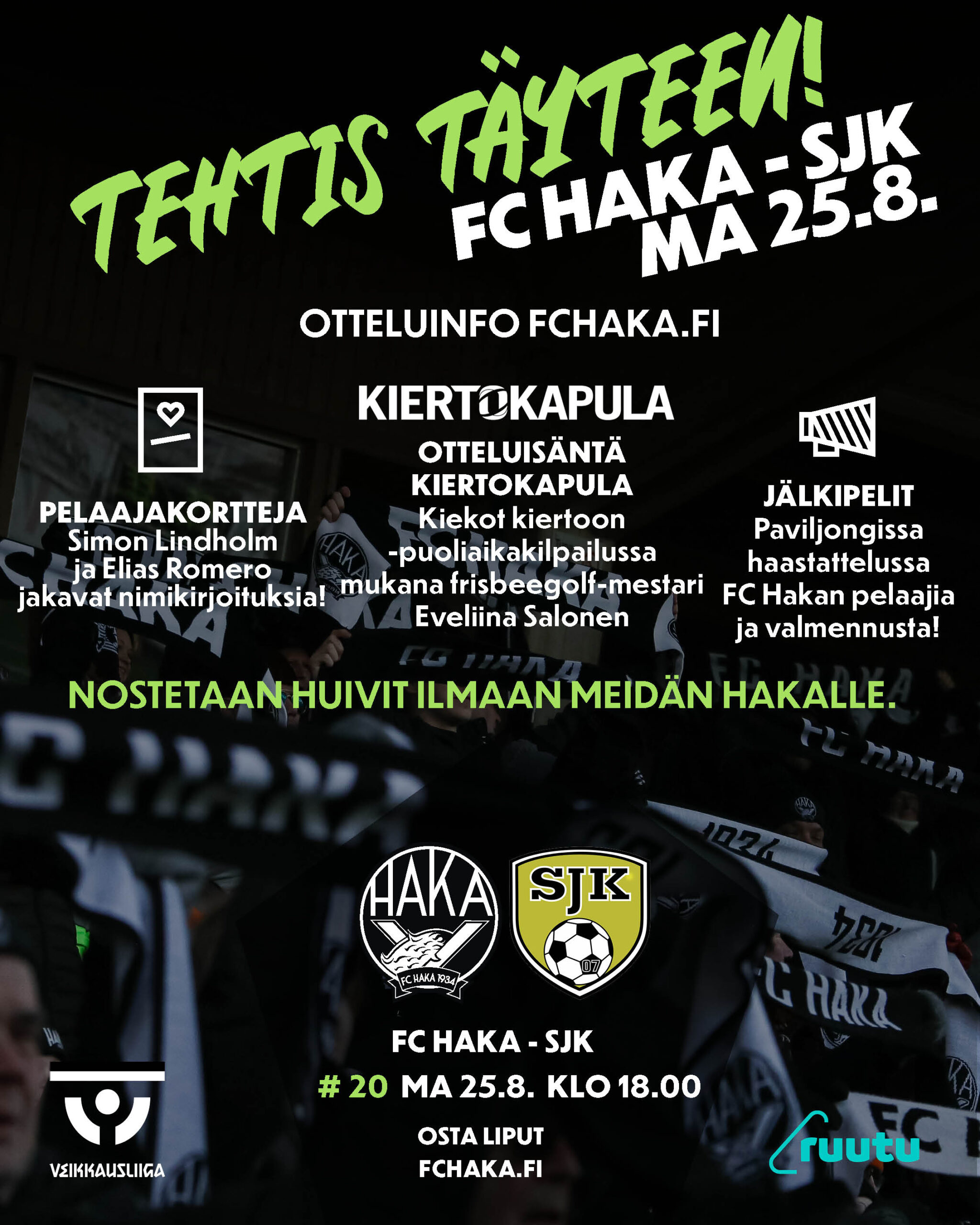 FC Haka – SJK, ma 25.8. klo 18.00 (portit avautuu 16.30). Otteluisäntä Kiertokapula.