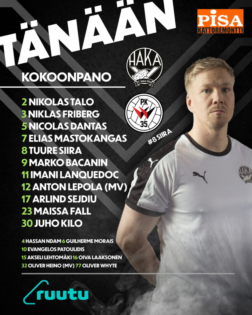 Tähänkin asti Suomen Cupin peleissä rotaatiota kokoonpanossa käyttänyt Haka oli tällä kertaa pakotettu tekemään muutoksia myös loukkaantumisista johtuen. Poissa ottelusta loukkaantumisista johtuen olivat Ryan Mahuta, Haymenn Bah-Traore, Rodrigo Macedo, Eemeli Mäkelä, Tuukka Törmä ja Liam Hughes, mikä pakotti valmennuksen muun muassa istuttamaan Tuuren Siiran oikean pakin paikalle. Siira kuitenkin sai puhtaat paperit omasta iltapuhteestaan, kuten nolla omassa päässä myös tavallaan vahvistaa.