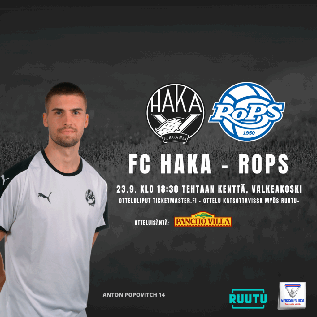 FC Haka kohtaa Tehtiksellä RoPS:n keskiviikkona 23.9. klo 18.30. Ottelun liput tulevat myyntiin tänään 16.9. kello 16.00.
