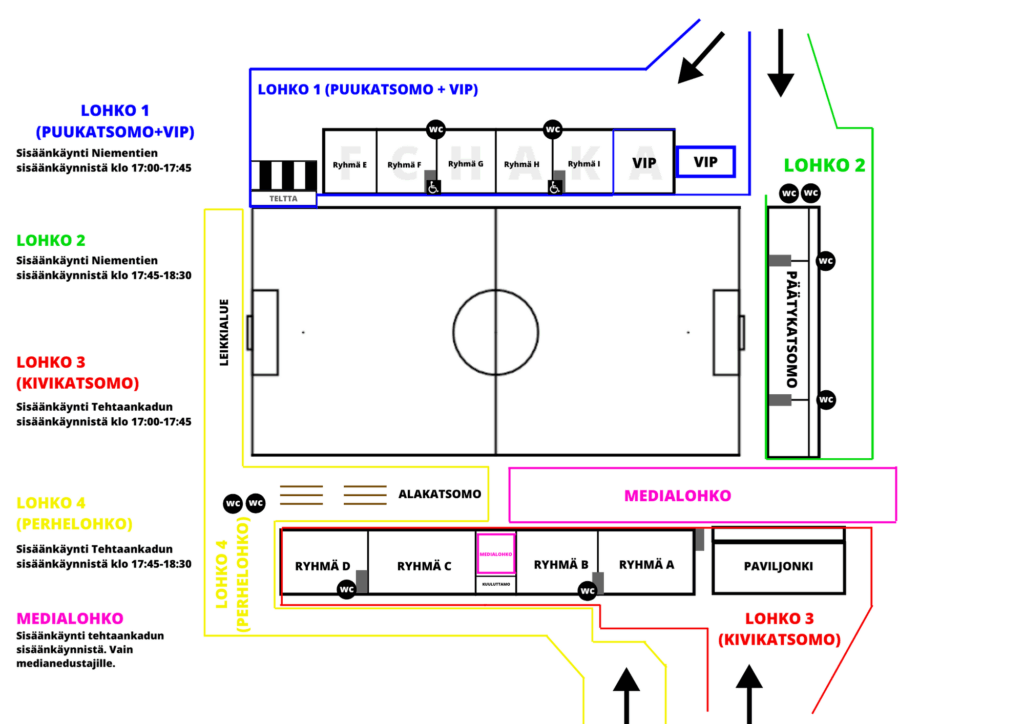 Tarkasta oheisesta kartasta lohkojako, sekä kunkin lohkon sisäänpääsyaika. Lohkoja on kaikkiaan viisi kappaletta, mutta medialohkoon ei ole lippuja myynnissä ja sinne on pääsy vain median edustajilla, sekä henkilökunnalla. Vierasjoukkueen kannattajat sijoittuvat lohko 2 päätykatsomon Niementien puoleiseen päätyyn.