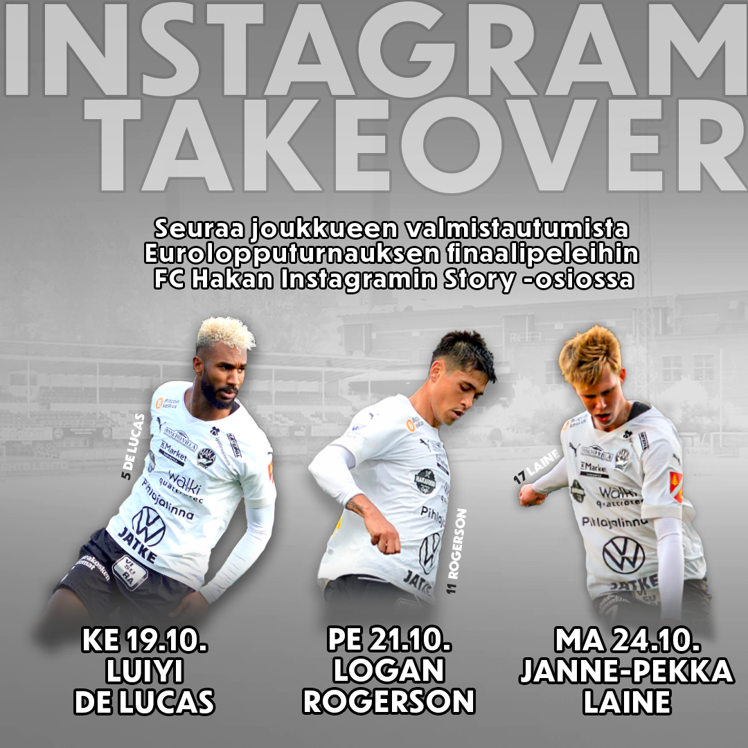 Kolme pelaajaa jakavat päiväänsä FC Hakan Instagramin Story-osuudessa. Homma lähtee tulille huomenna keskiviikkona 19.10., kun ensimmäisenä päivittäjänä toimii toppari Luiyi de Lucas! Perjantaina 21.10. Instagramin nappaa haltuun huikeaa kautta pelaava Logan Rogerson ja vielä ennen ensimmäistä osaottelua maanantaina 24.10. isoa roolia tällä kaudella omaksunut Janne-Pekka Laine.