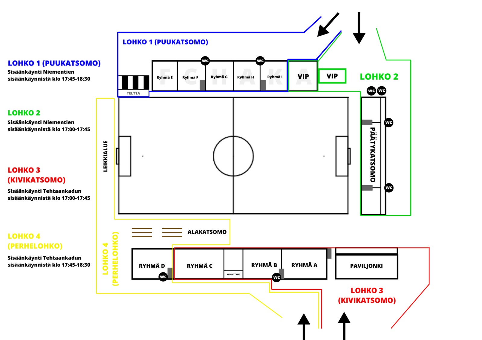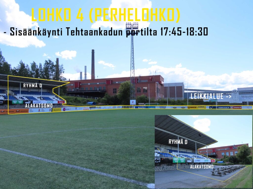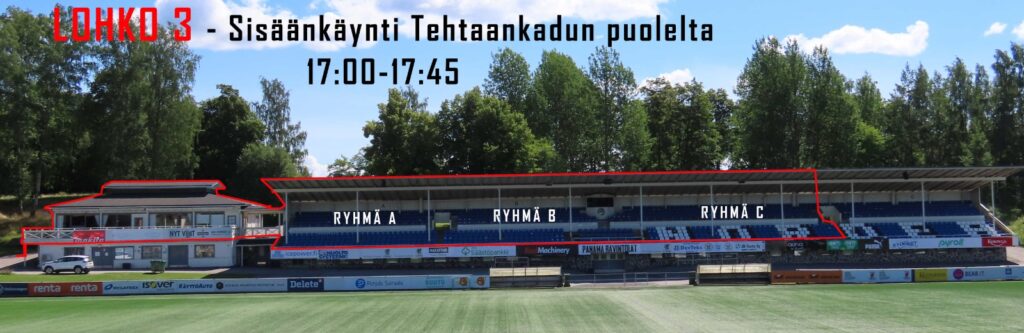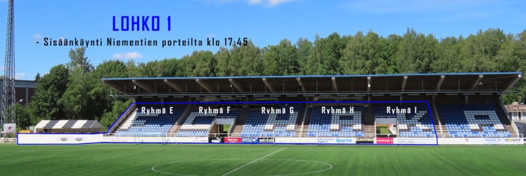 Lohkot 2 (päätykatsomo + VIP) ja 3 (kivikatsomo) pääsevät ensimmäisenä sisään kello 17.00-17.45.