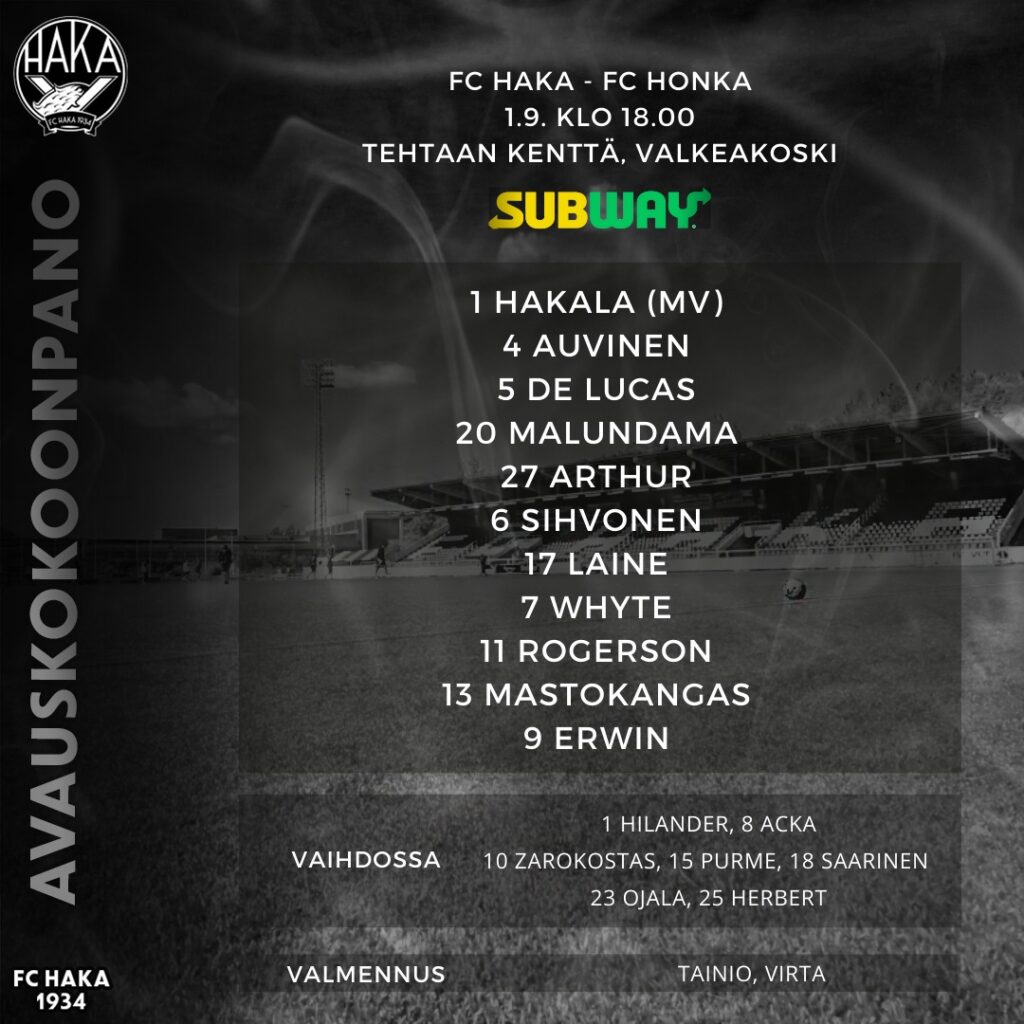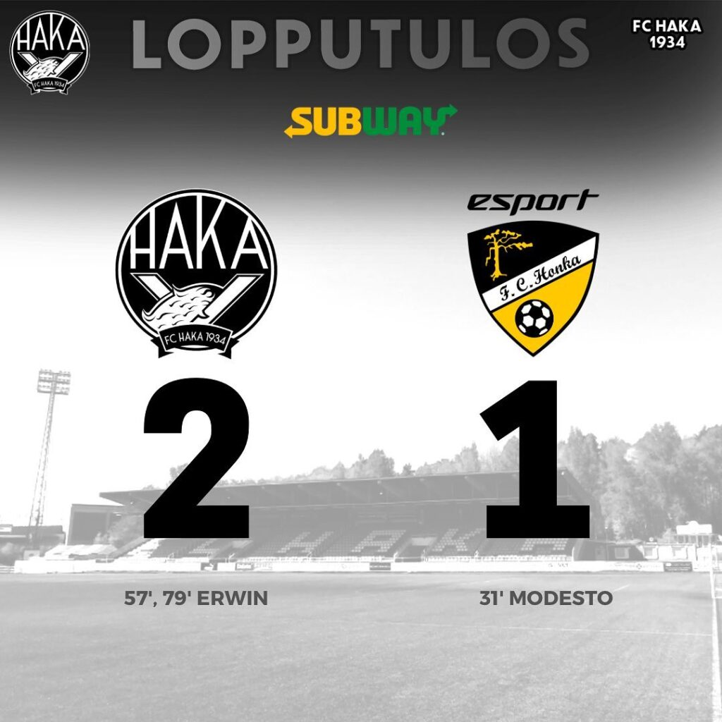 Haka vaihtoi 79. minuutilla kentältä pois Janne-Pekka Laineen, sekä Oliver Whyten ja heidät korvasi Tino Purme, sekä Donaldo Acka. Kaksikko ei ehtinyt olla kentällä minuuttiakaan, kun Honka -maalissa pelannut Maksim Rudakov ohitettiin toistamiseen. Acka riisti pallon omalla puolustusalueella, syötti sen Purmeelle, joka puolestaan vapautti Erwinin nokikkain Rudakovin kanssa. Skottihyökkääjän kierteinen vasuri oli tarkkaakin tarkempi ja kiersi aivan vasemman tolpan juureen.