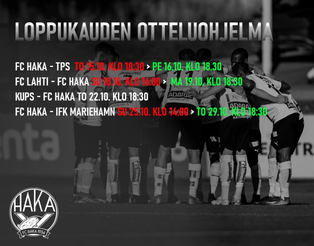 Veikkausliigan loppukauden otteluohjelmaan on tehty muutoksia, johtuen positiivisesta korona -tartunnasta Turun Palloseuran joukkueessa. FC Hakan ja TPS:n piti ottaa yhteen ensi viikon torstaina, mutta tämä ottelu siirtyy nyt päivällä eteenpäin. Myös muita otteluja on jouduttu siirtämään.