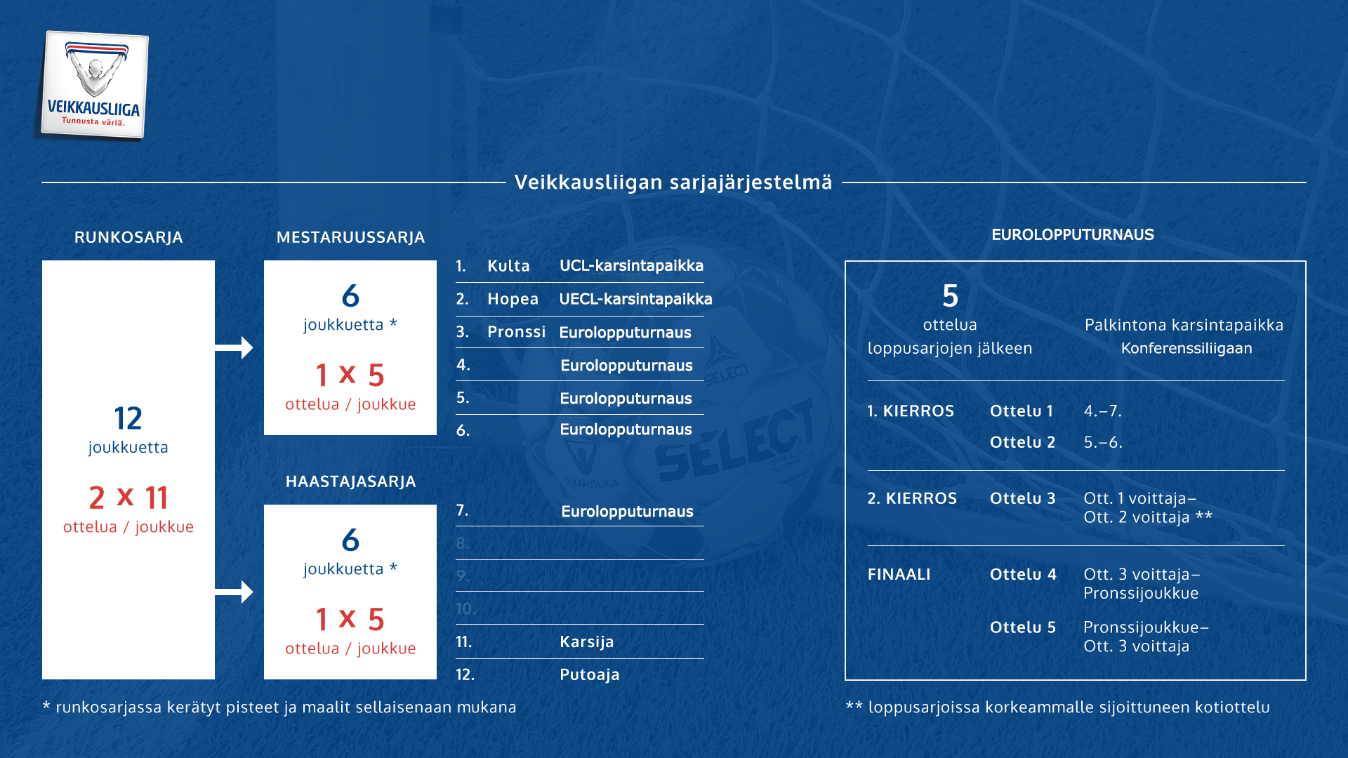 Veikkausliiga pelataan 12 joukkueen sarjana. Aluksi pelataan kaksinkertainen runkosarja, jonka päätteeksi jakaannutaan Mestaruussarjaan (runkosarjassa sijoille 1.–6. sijoittuneet joukkueet) ja Haastajasarjaan (runkosarjassa sijoille 7.–12. sijoittuneet joukkueet), joissa pelataan yksikertainen sarja. Jatkosarjoja pelataan jatkumona runkosarjalle, jolloin runkosarjassa saadut pisteet ja maalit seuraavat mukana sellaisenaan jatkosarjoihin ilman muutoksia.