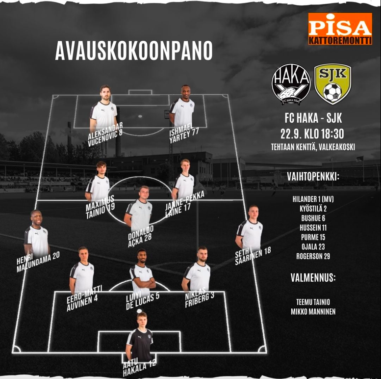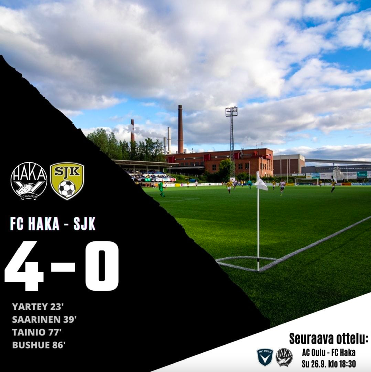 Ja jottei illasta olisi tullut kotijoukkueelle yhtään huonompi, kuin joukkueiden edellisessä kohtaamisessa, niin kapteeni Jacob Bushue viimeisteli loppulukemat 4-0 uransa ensimmäisellä Veikkausliigamaalillaan. Näin siis Haka kuittasi parhaalla mahdollisella tavalla elokuun lopun Seinäjoen vierailun ja nousi samalla pois karsijan paikalta sijalle 10.