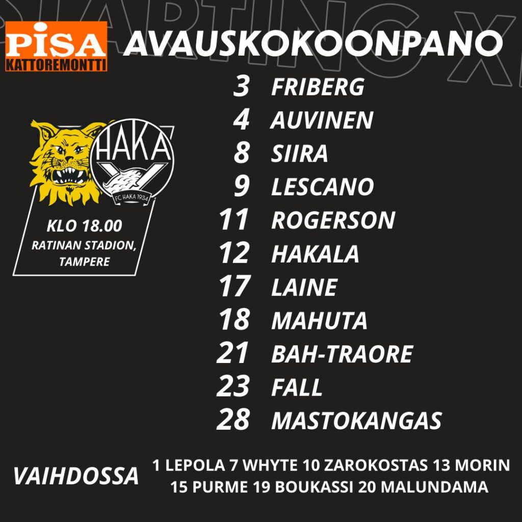 Haka sai kovan takaiskun 19. minuutilla, kun Janne-Pekka Laine joutui jättämään kentän loukkaannuttuaan. Laine on ollut isossa roolissa koskilaisten keskikentällä läpi kauden ja oli erittäin pirteällä pelipäällä myös perjantaina. Keskikenttämiehen korvasi Tino Purme, eikä vaihto lopulta aiheuttanut niin isoa lovea valkopaitojen peliin, kuin moni pelkäsi.