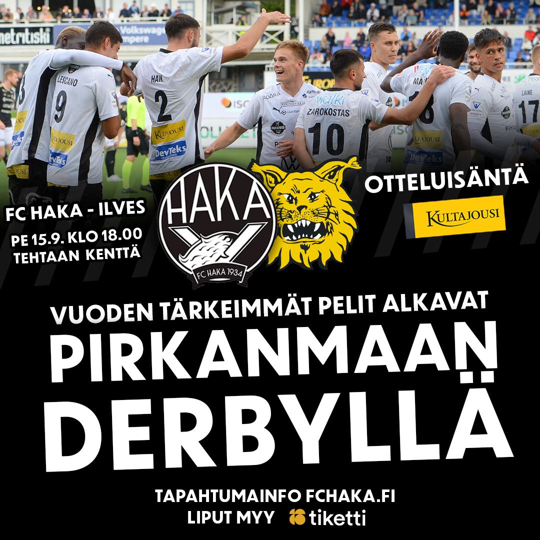 FC Haka – Ilves, Tehtaan kenttä, pe 15.9. klo 18.00 (portit auki 16.30), liput Tiketistä.