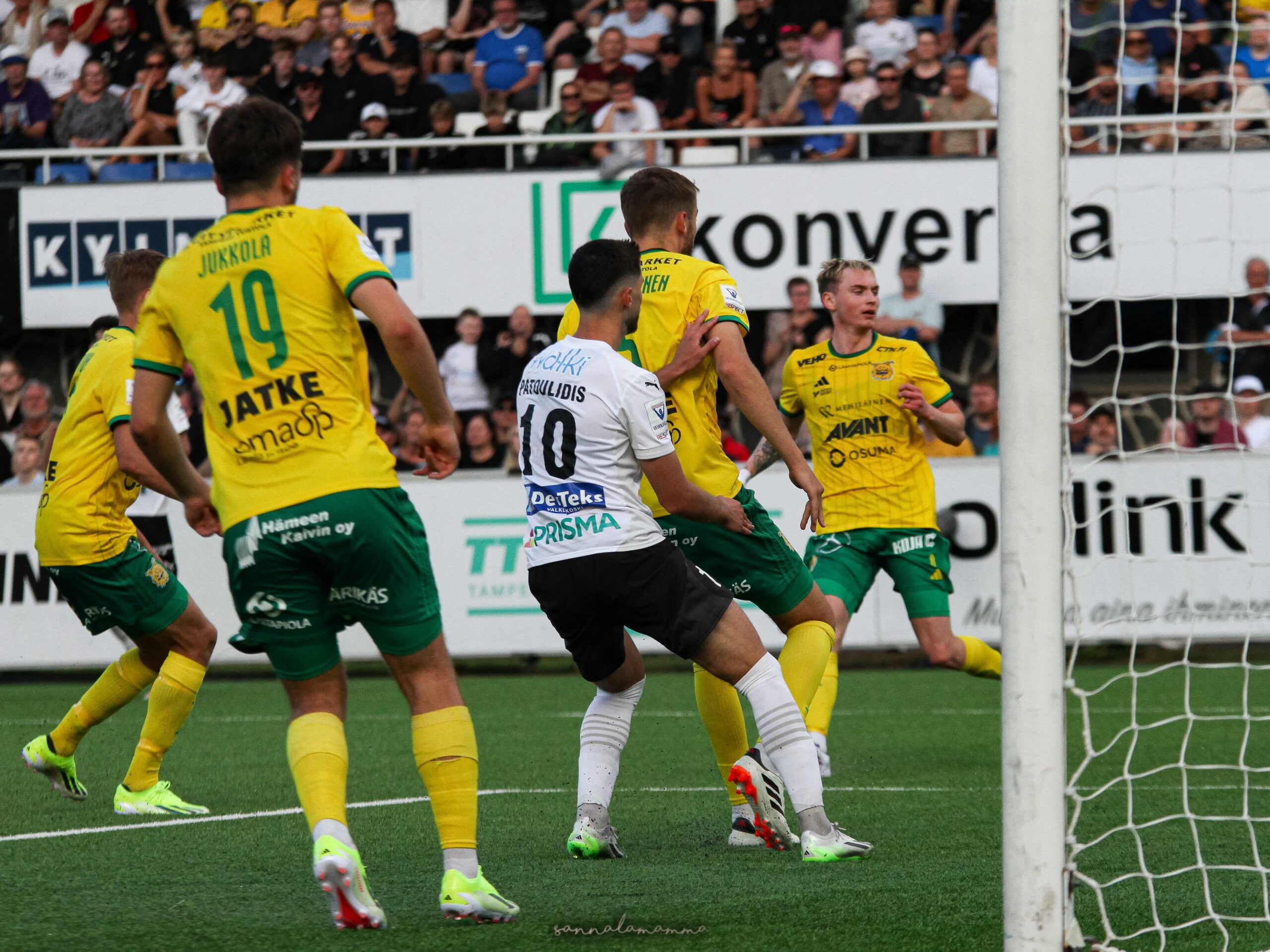 Ja niin sitä toden totta olikin tulossa. Tehtaan kenttä räjähti kuusi minuuttia myöhemmin, kun Evangelos Patoulidis nappasi Santeri Haaralan hiljaisen poikittaissyötön Juhani Pikkaraisen nenän edestä ja karkasi läpiajoon, minkä päätteeksi kiersi Ville Sepän ja iski voittolukemiksi 4-3!