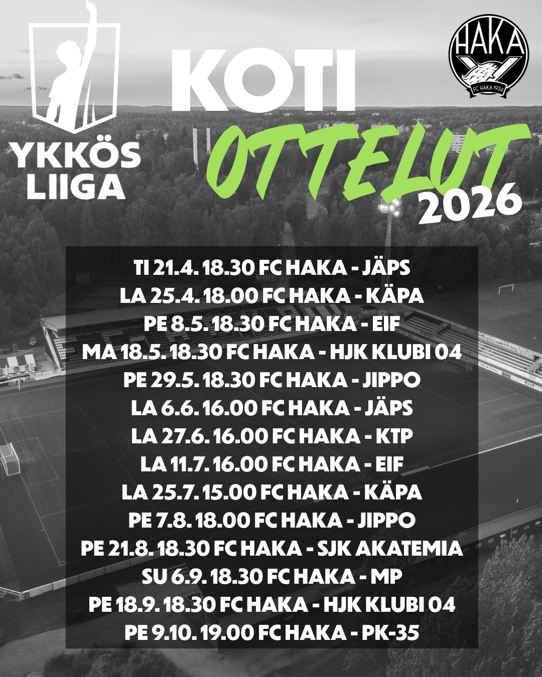 FC Haka aloittaa kautensa Kotkassa KTP:n vieraana keskiviikkona 1. huhtikuuta ja ensimmäisen kerran valkopaidat esiintyvät Tehtaan kentällä tiistaina 21. huhtikuuta, jolloin vastaan asettuu Järvenpään Palloseura.